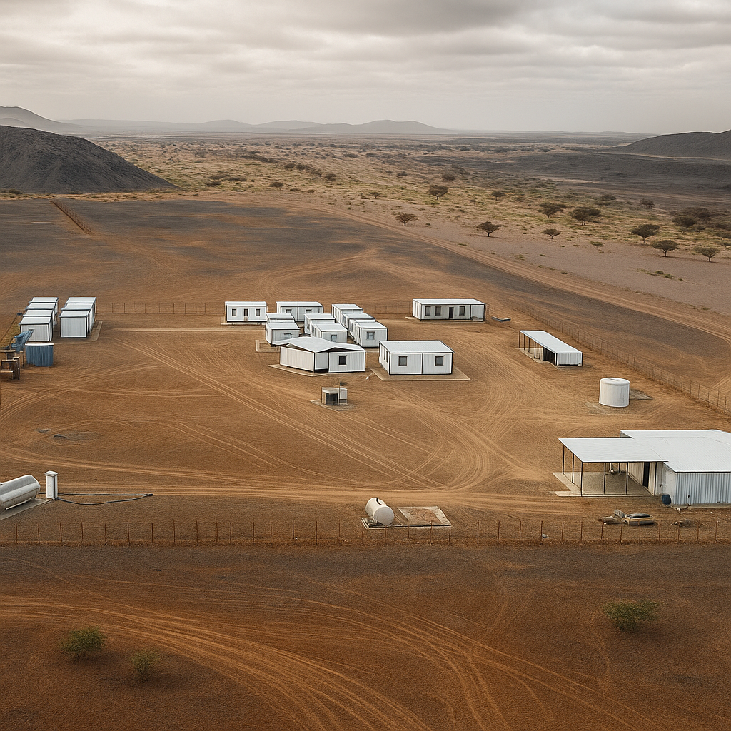 Construction of fully equipped basecamp using modified containers, steel structures, and prefabricated units Installation of Water, Electricity and Fuel Supply